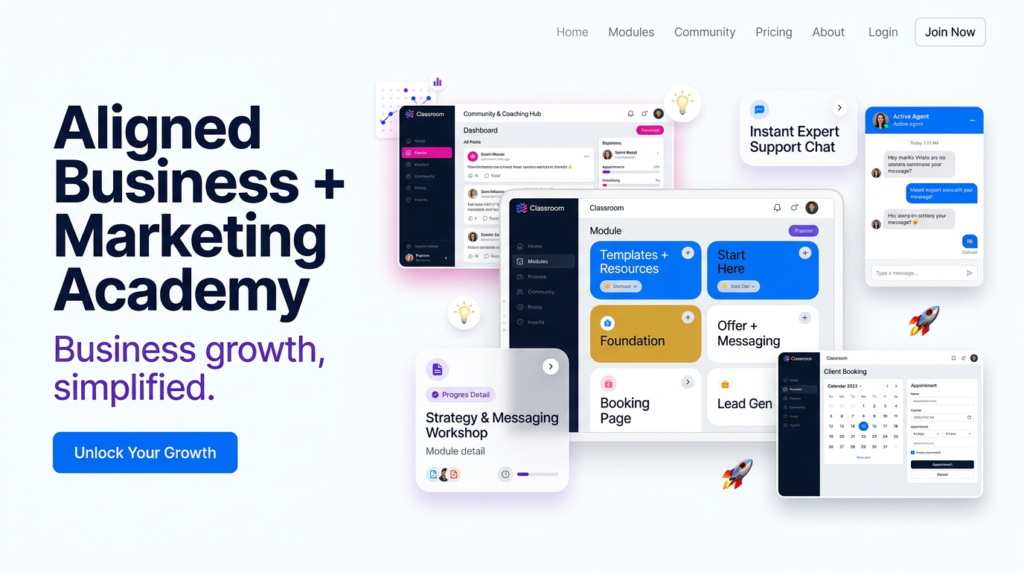 Most businesses don’t fail because of their product or service — they fail because their marketing is inconsistent. Aligned Business + Marketing Skool gives you the structure, leadership, and momentum to finally make marketing work for you.